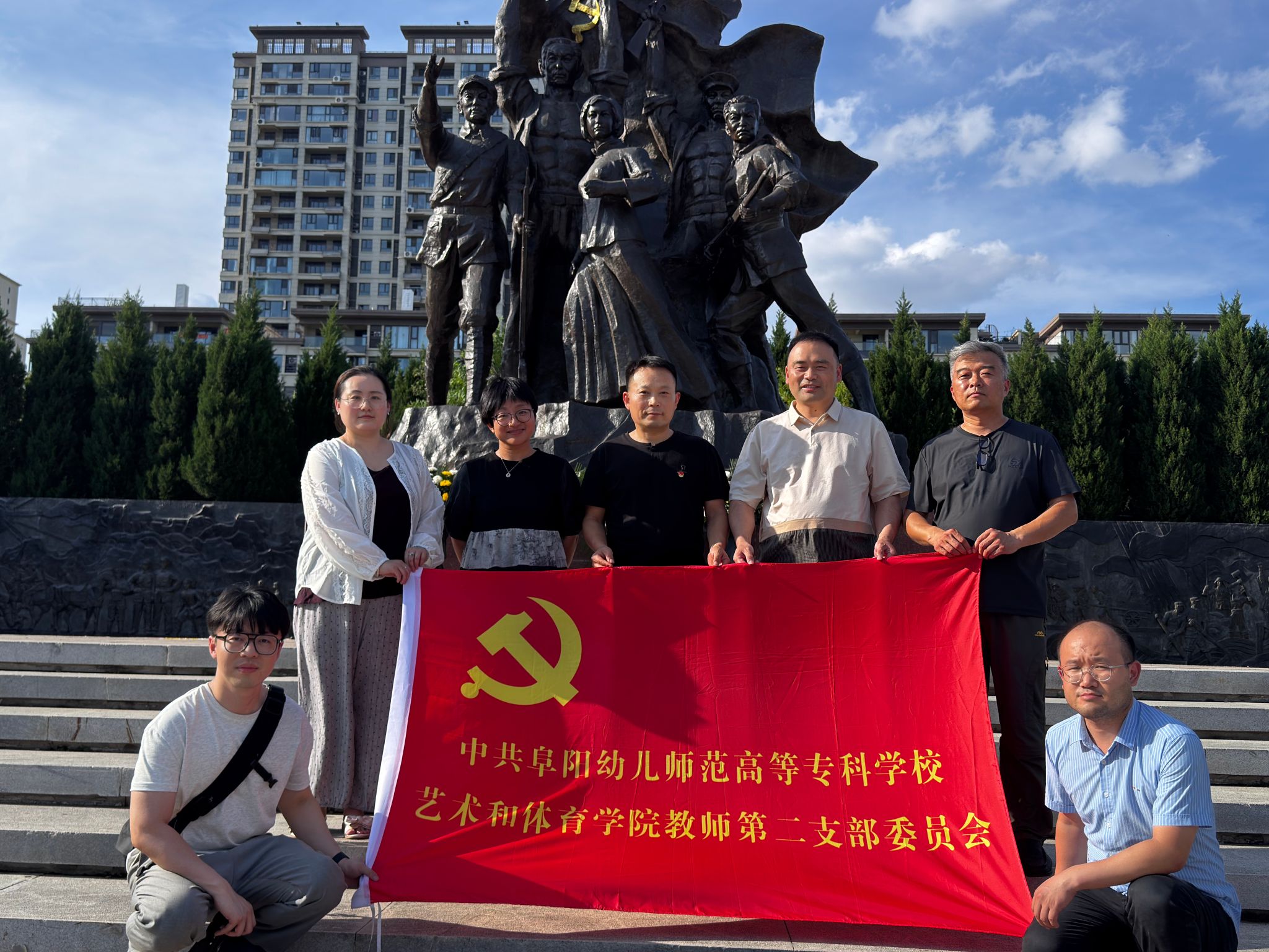 在党的 104 岁生日当天,艺术和体育学院党总支在阜阳市和平广场革命纪念馆开展 “缅怀先烈初心遗志,谨记八项规定精神” 主题党日活动,以红色教育与作风建设双主线,为全体党员上了一堂沉浸式党课。