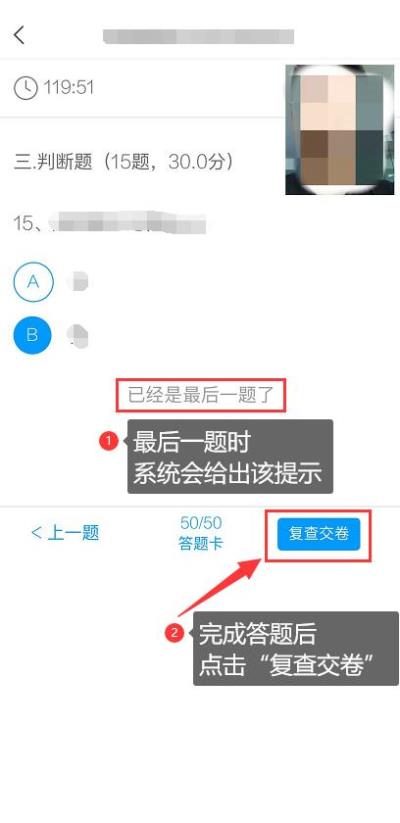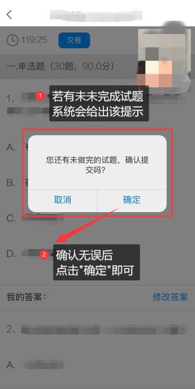 5.核查作答情况时,可修改选择答案;确认无误后,点击最上方的“交卷”按钮,并确认提交。(若存在未作答题目,系统会提示,请注意核查!)