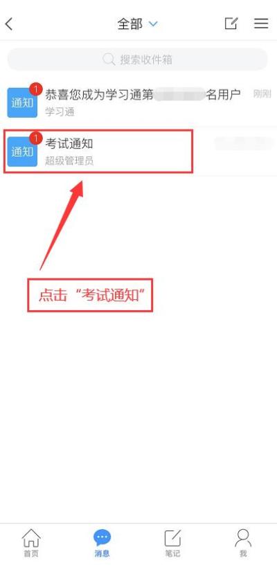 1.点击最下方“消息”,后点击“收件箱”;找到“考试通知”,点击进入;