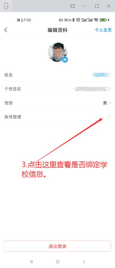 点击头像,进入“编辑资料”,点击“账号管理”,查看“单位设置”中是否有正确的学校名称和本人身份证号(考生号)出现。